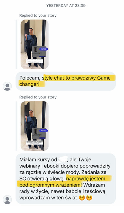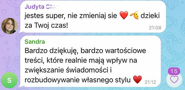 Dostęp do grupy: STYLIZACJE STYLE CHAT, udostępnionej w trakcie trwania projektu, gdzie będziecie miały możliwość publikacji zdjęć swoich outfitów. Pomogę Wam je dopracować i podpowiem, co zrobić, by wyglądały jeszcze lepiej. Otrzymacie konkretne wskazówki i profesjonalne wsparcie w budowaniu swojego stylu.
