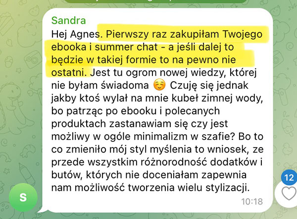 Wszystko zaczęło się latem 2024 roku od prostej potrzeby- chciałam dzielić się z innymi moimi najlepszymi znaleziskami z wyprzedaży. Tak narodził się Summer Sale Chat na WhatsAppie, który błyskawicznie zgromadził społeczność 500 kobiet. Po zimowej edycji poczułam, że same linki to za mało. Chciałam dawać Wam realną wiedzę: uczyć metod stylizacji i ułatwiać codzienne wybory. Od tamtej pory projekt ewoluował nie do poznania, stając się przestrzenią, w której moda łączy się z praktyczną edukacją i pewnością siebie. Dziś to już nie tylko chat o promocjach, ale prawdziwa modowa społeczność, która codziennie inspiruje mnie do działania. To zupełnie nowe miejsce, w którym wiedza o modzie jest dostępna na wyciągnięcie ręki.